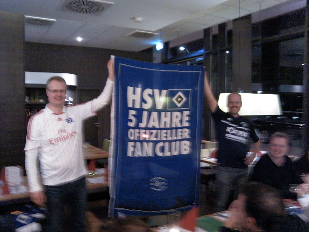 am gestrigen Tag feierten wir unseren 5. Geburtstag in Hamburg. Neben dem Besuch zum Bundesligaspiel im Volksparkstadion stand auch ein gemeinsames Essen in der Hafencity auf dem Programm. Dabei konnten wir Joachim Ranau (HSV-Fanbeauftragter) und Nicole Peters (Ansprechpartnerin für offizielle HSV-Fanclubs) sowie unseren zuständigen Regionalbetreuer, Stefan "Eddy" Nowski, in unseren Reihen begrüßen. Vielen Dank an dieser Stelle für euren Besuch! Zum Spielausgang und der weiteren Zukunft unseres HSV gab es zumindest an diesem Abend leider viel Gesprächsstoff.