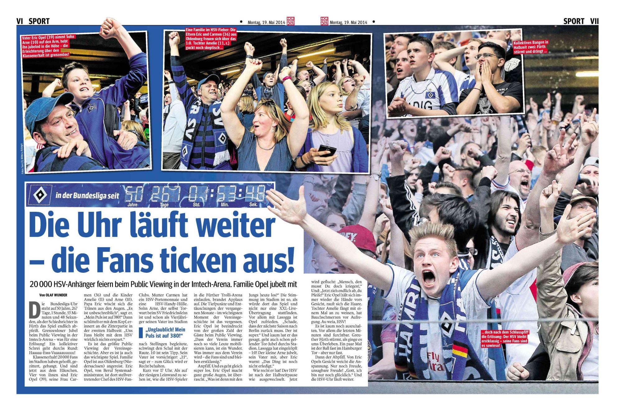 Als wäre der Anlass zum Volksparkstadion zu gehen, für einen übermäßigen Adrenalinausstoß nicht schon genug gewesen. Nein, auf Nachfrage zweier Reporter wurden Carmen und ich von der Hamburger Morgenpost (MoPo), vor, während und nach dem Spiel auf Schritt und Tritt verfolgt. Jeder Moment des Spielverlaufs was Regungen und Äußerungen unsererseits angingen, sollte von einem Fotografen und Reporter der MoPo festgehalten werden.